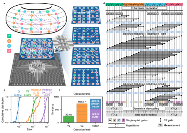 图1.“昆仑”量子处理器架构图以及双变量自行车码的非局域稳定子提取线路