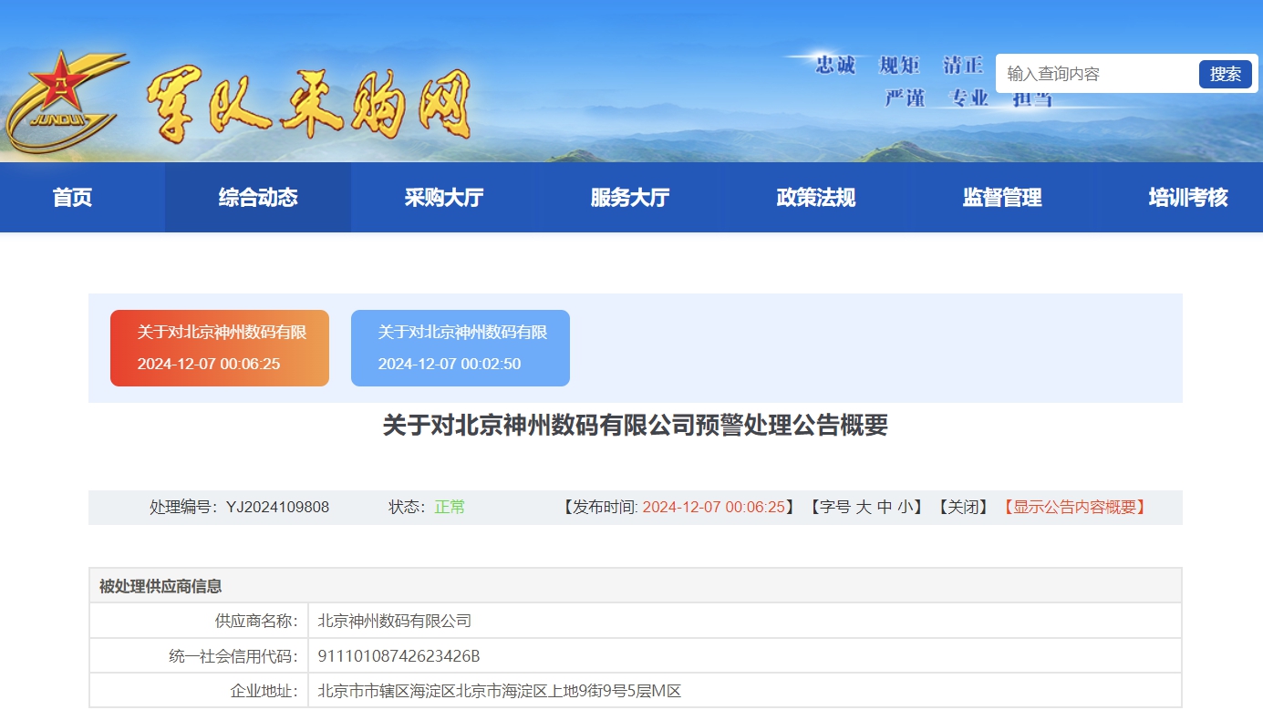 C114讯 12月9日消息(颜翊)日前,军采网发布一则关于对北京神州数码有限公司预警处理公告。