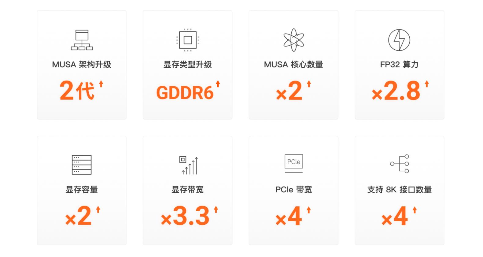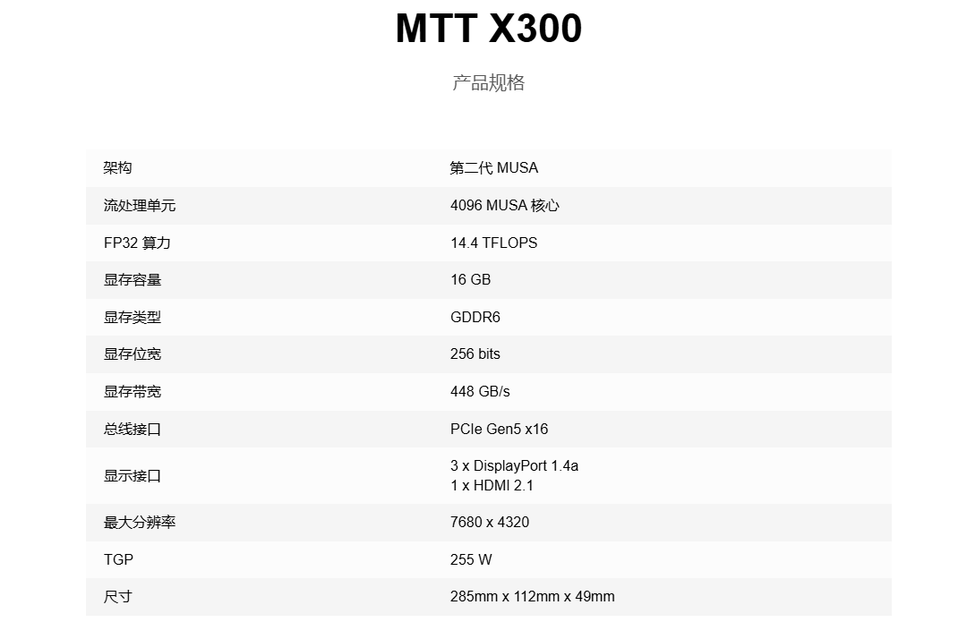 硬件参数上,MTT X300基于第二代MUSA架构“春晓”GPU核心,内置4096个MUSA流处理单元,单精度浮点算力达到14.4TFLOPS,配备16GB GDDR6显存,总线接口PCIe 5.0 x 16,TGP功耗255W。