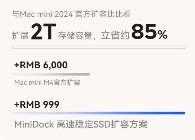 从容量配置来看,MiniDock提供了从512GB到8TB的多个版本选择,2TB扩容版本的售价约为993元,相比之下仅约为苹果官方扩容至2TB存储价格的16%。这种灵活的容量选择和相对亲民的价格策略为用户提供了更为实惠的选择。