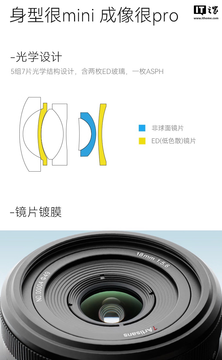 参考商品页,这款镜头镜身采用金属材质,整体重量 146 克,最近对焦距离 0.3 米,采用手动对焦形式,使用 5 组 7 片光学结构设计,含两枚 ED 低色散镜片、1 枚 ASPH 非球面镜片。