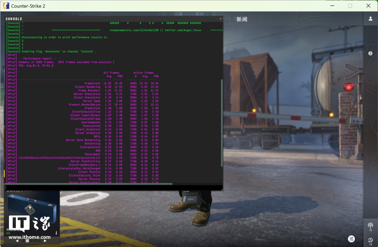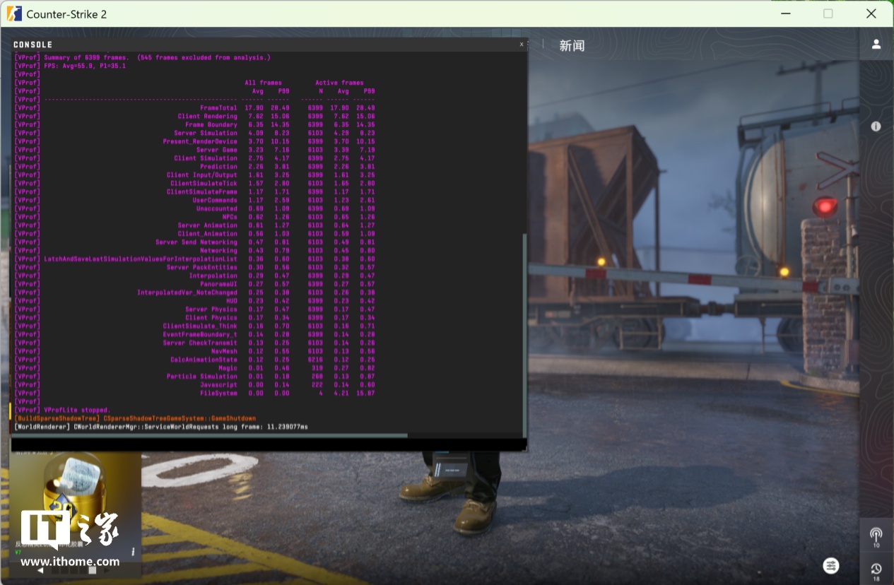 游戏性能方面,IT之家实测了《CS2》在 1200P 的高画质下运行 Benchmark 平均帧率为 55.9FPS,1% Low 帧为 36.1%,可以流畅游玩。