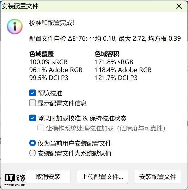 色彩方面,ThinkPad X1 Carbon 2025 Aura 支持 100% P3 广色域覆盖。IT之家实测,其可以覆盖 99.5% 的 DCI-P3 色域,色彩容积可达 121.7% 的 DCI-P3。在色准的表现上,平均 △ E 为 0.18,最大 △ E 为 2.72。ThinkPad X1 Carbon 2025 Aura 这块屏幕无论是色彩的丰富程度还是色准均表现十分出色。