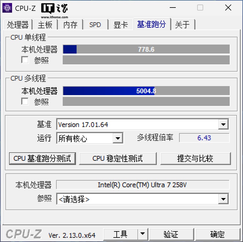 下面进入理论测试环节,在 CPU-Z 的测试中,Intel 酷睿 Ultra 7 258V 处理器跑出了单核 778.6,多核 5004.8 的分数。