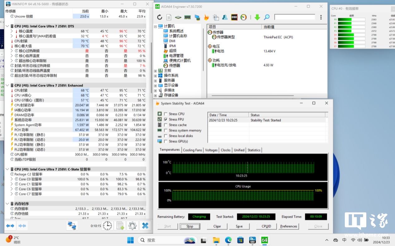 首先是十分钟的 FPU 单烤,烤机刚开始 ThinkPad X1 Carbon 2025 Aura 的 Ultra 7 258V 以近 37W 的最大睿频功耗运行,约 3 分钟后,CPU 的封装温度达到了 96°C,随后 CPU 整体功耗降至 20W,烤机十分钟后,Ultra 7 的 P 核主频约为 2.8GHz,E 核主频约为 3.2GHz,此时核心温度约为 70°C,可以看到,因为 Lunar Lake 架构更偏向高能效比的表现,即便是可以有着更高的散热表现,ThinkPad X1 Carbon 2025 Aura 也倾向稳定在 20W 左右能效比较好的功率进行输出。