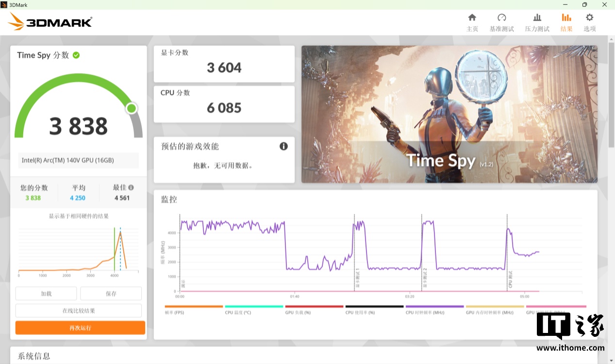 GPU 性能方面,在 3DMark 的 Time Spy 测试中,CPU 物理分数 6085 分,核显分数则是达到了 3604 分。