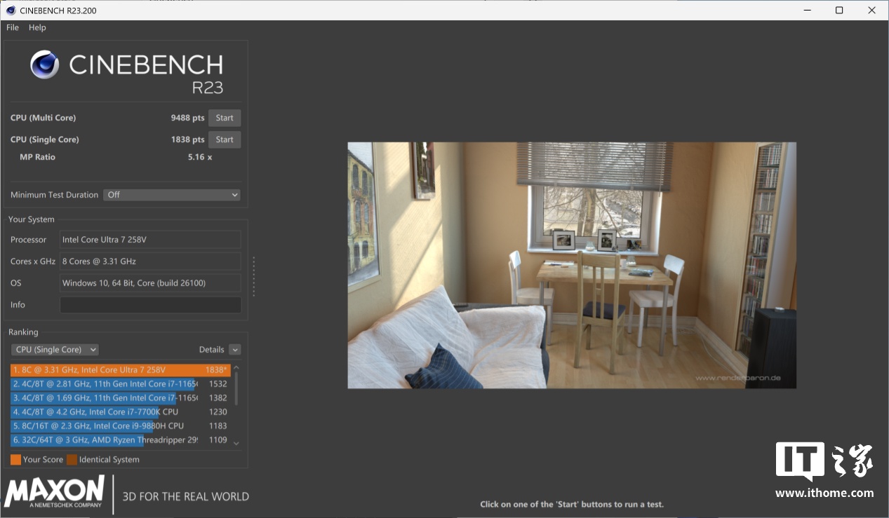 在 CineBench R23 的测试中,ThinkPad X1 Carbon 2025 Aura 所搭载的 Intel 酷睿 Ultra 7 258V 处理器跑出了单核 1838 分,多核 9488 分的成绩。