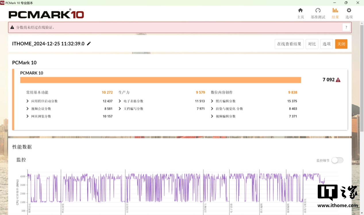 而在 PCMark 10 现代办公测试中则是获得了 7092 分,其中常用基本功能的轻度生产力的得分为 10272,较为出色。