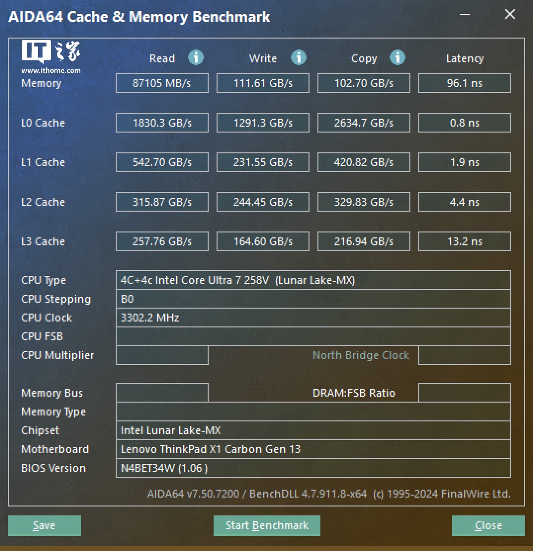 IT之家首先对 Ultra 7 258V 封装了两颗 16GB 的 LDDDR5x 8533MT/s 内存使用 AIDA64 做了性能测试,其顺序读取可达 87105MB/s,顺序写入 111.61GB/s,数据拷贝 102.70GB/s,延迟则仅有 96.1ns。整体符合 8533MT/s 的内存性能表现。