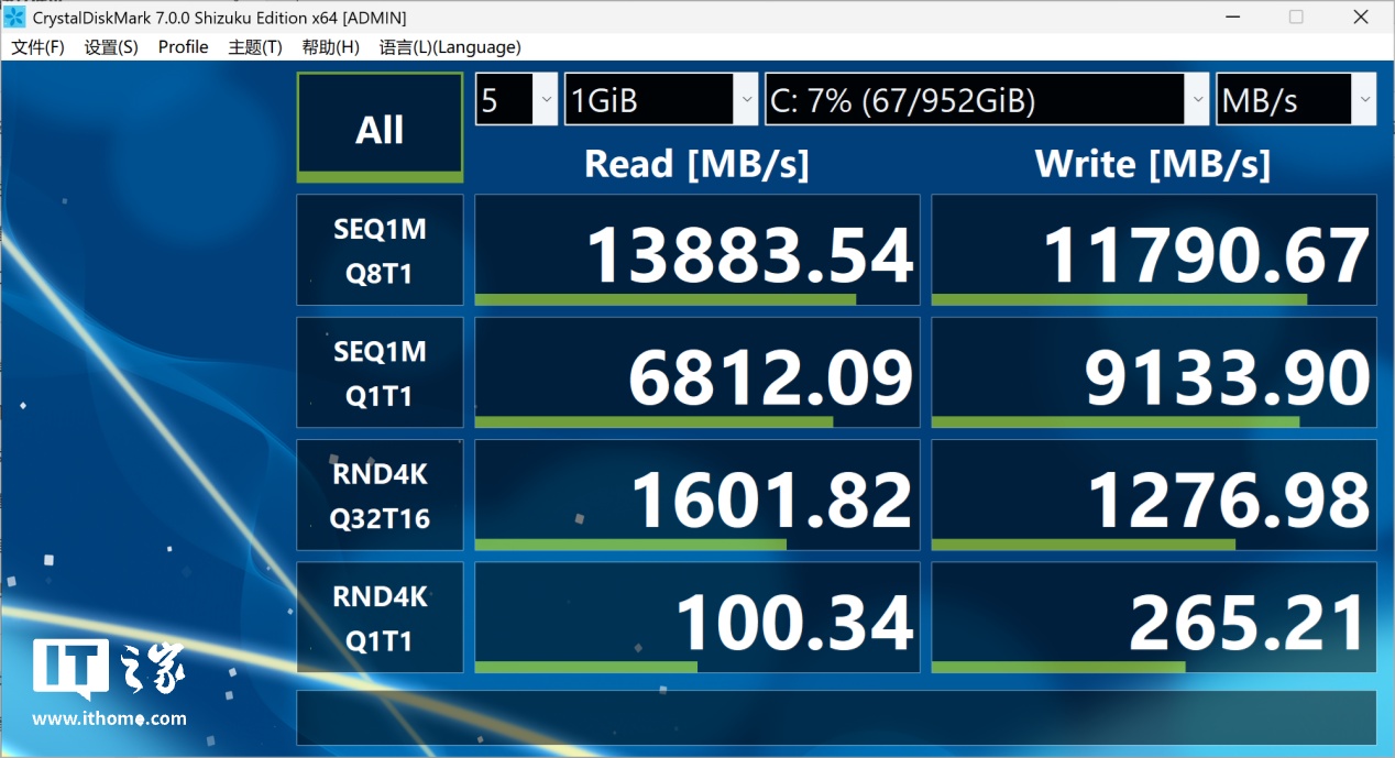 IT之家使用 CrystalDiskMark 为其做了性能测试,其顺序读取速度为 13800MB/s+,顺序写入速度也有接近 11700MB/s+ 的表现,4K 读取写入的速度也都在 1.2GB/s 以上,符合 PCIe 5.0 SSD 的性能表现,笔者也是头一次在笔记本中见到这样夸张的硬盘性能。
