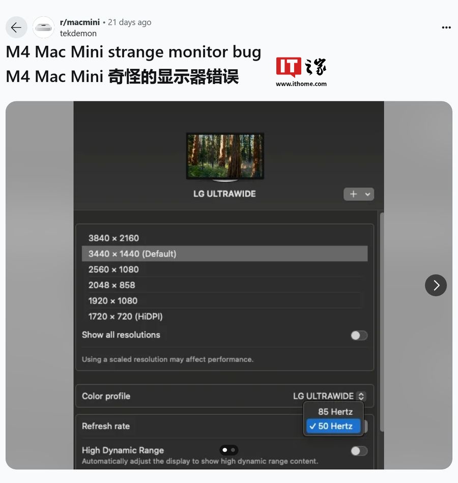 Mac mini 用户报告的问题较多,但 M4 MacBook Pro 用户也反馈遇到了类似问题。部分用户表示,在 M1 MacBook Pro 上可以正常使用 HiDPI 选项,但在 M4 MacBook Pro 上则无法使用。