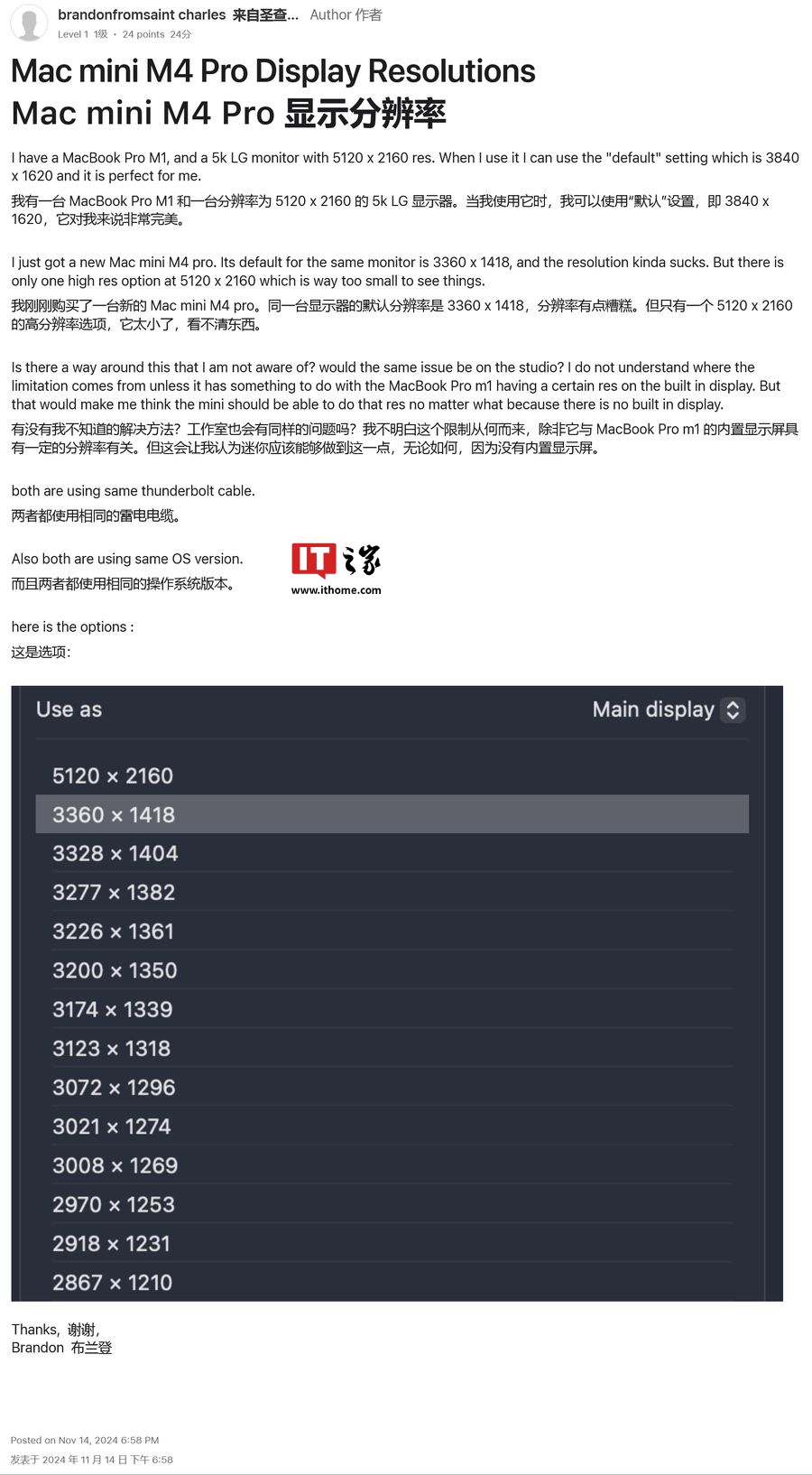 IT之家附上苹果售后论坛、Reddit 社区上用户反馈,在外接 5K2K(5120 x 2160)分辨率的显示器情况下,M4 Mac 设备无法正确显示分辨率选项,让界面和文本看起来模糊。