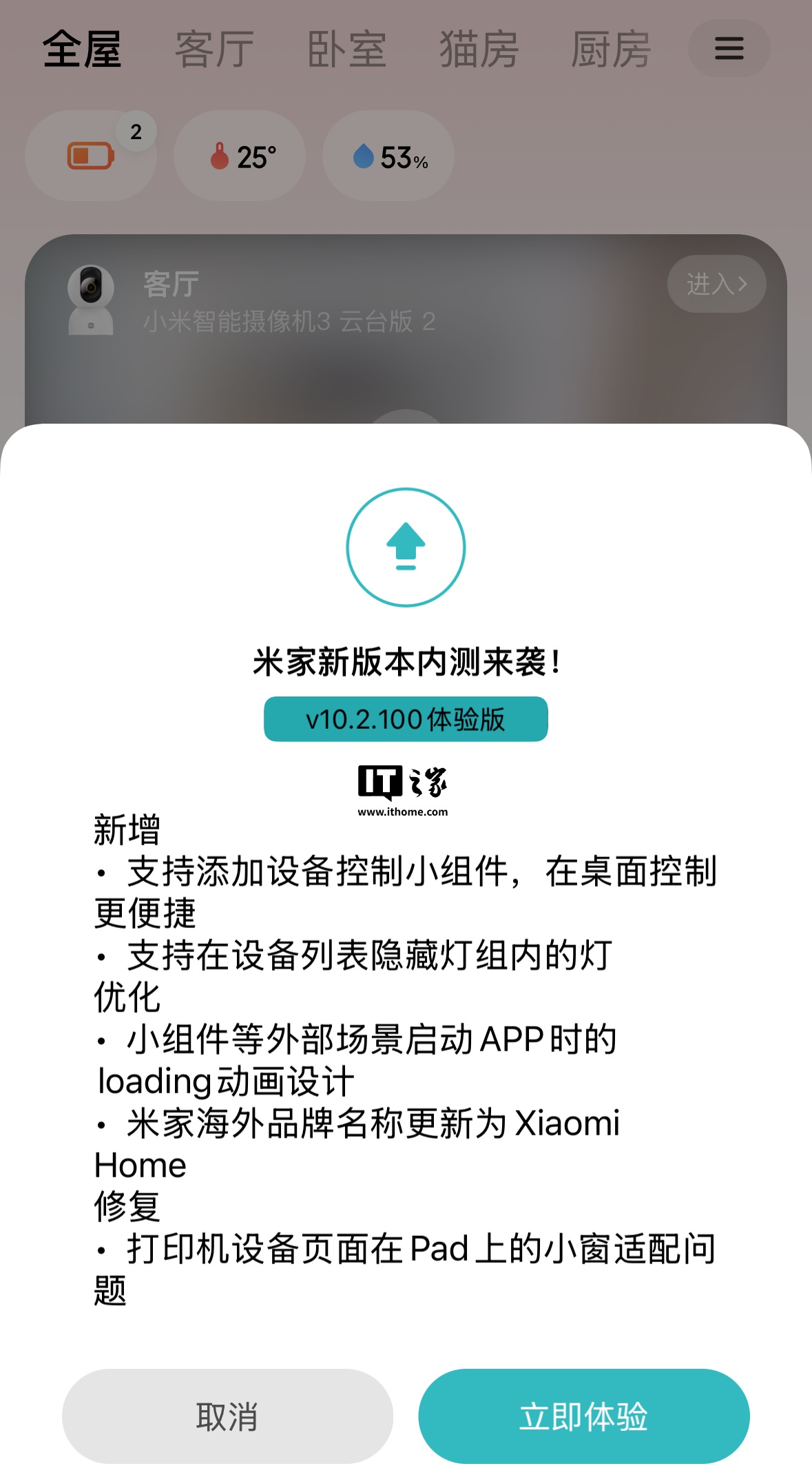 IT之家 12 月 31 日消息,小米米家 iOS 端 App 现获 v10.2.100 体验版内测升级,新版本支持桌面添加设备控制小组件等功能。IT之家附更新内容如下: