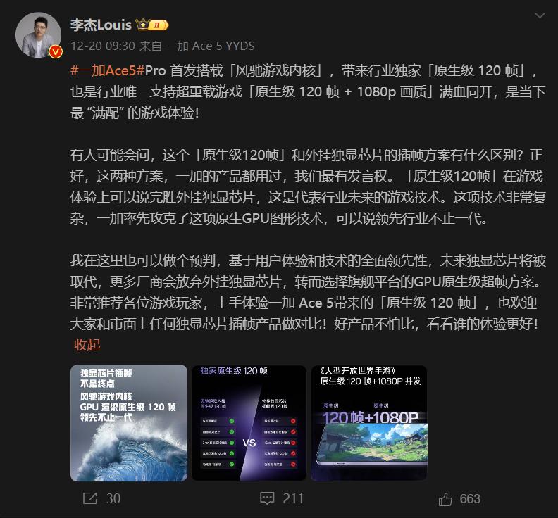 结果到了一加这边,为了宣传新品Ace5系列,近段时间李杰则是在疯狂宣传自家的内插帧特性“风驰游戏内核”,并放出豪言:“未来更多厂商会放弃外挂独显芯片,选择GPU原生级超帧方案”,也因此在数码社区里引发了不小的争议。
