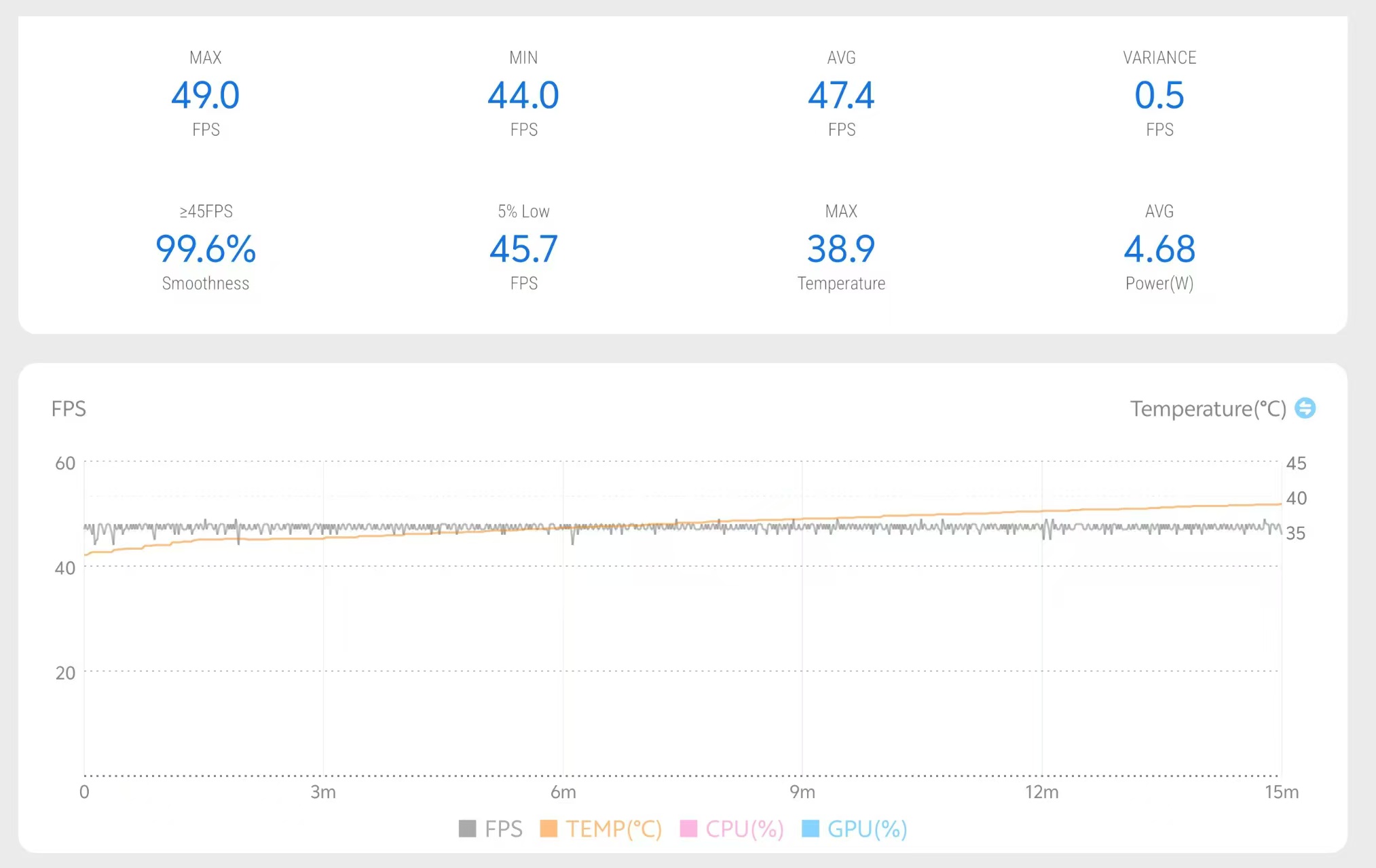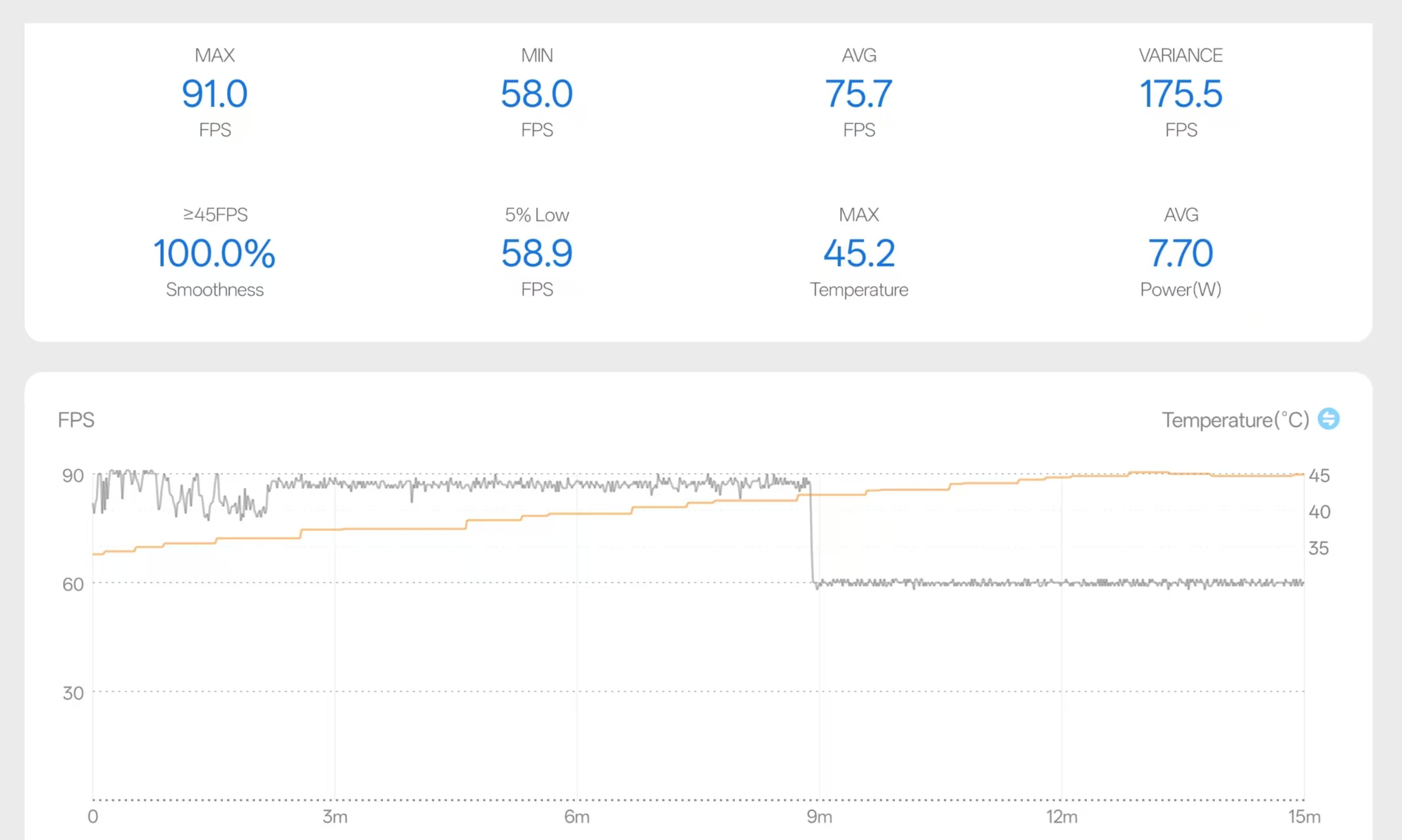 作为对比,真我Neo 7则可以将画面帧数插至90帧,采用的是原生45帧+1插1的做法,实际游戏运行10分钟后,便会因为整机过热退出超级帧率,而且整机峰值功耗来到了惊人的近9W的水平。