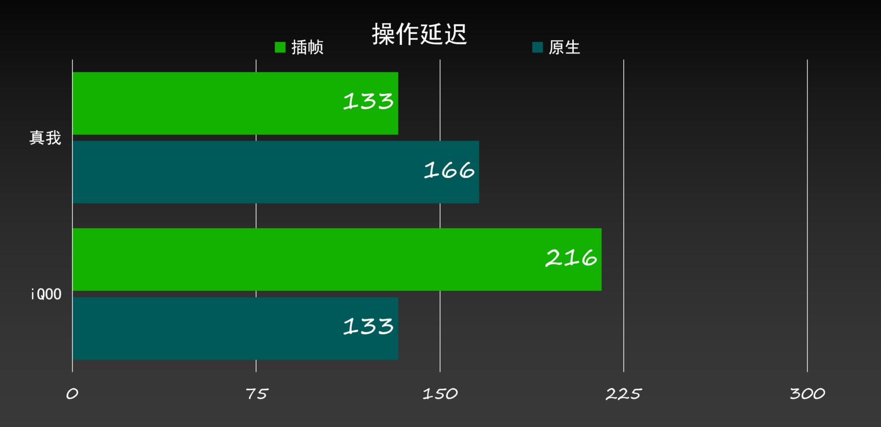 在开启插帧后,真我的操作延迟似乎还有所下降,合理怀疑这是因为“内插帧”技术会允许GPU渲染的生成帧能够接收输入指令;而iQOO这边生成的渲染帧应该是无法接收输入指令的,但是操作延迟也没有提升到一个非常夸张的水平。
