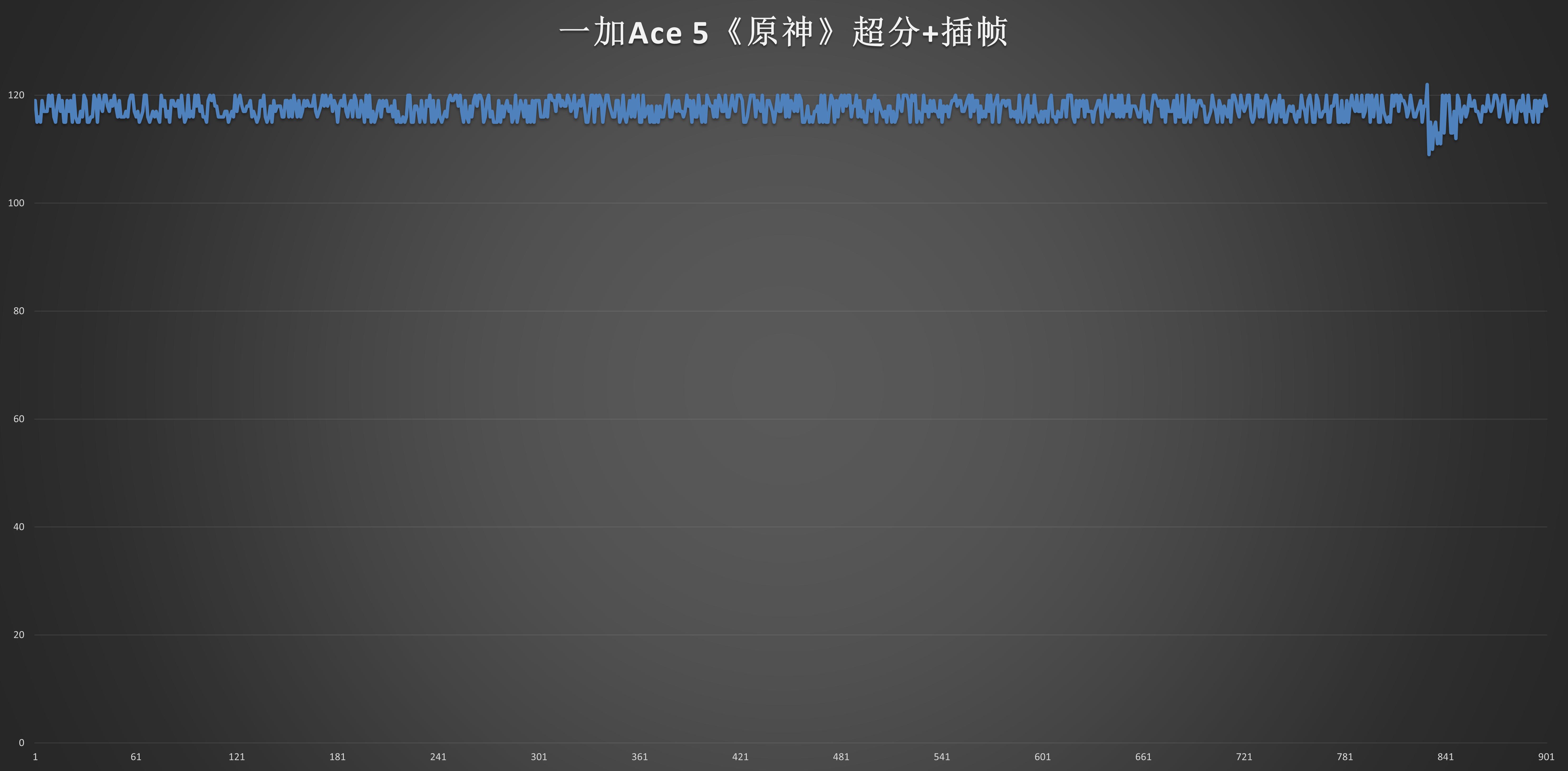 而一加Ace 5这边,则可以将画面超分插帧至900P+120帧,采用的是原生60帧+1插1的做法,实际游戏过程中的表现足够稳定,平均帧数约118.4帧,整机功耗则从原生60帧运行的4W出头来到了6W左右。