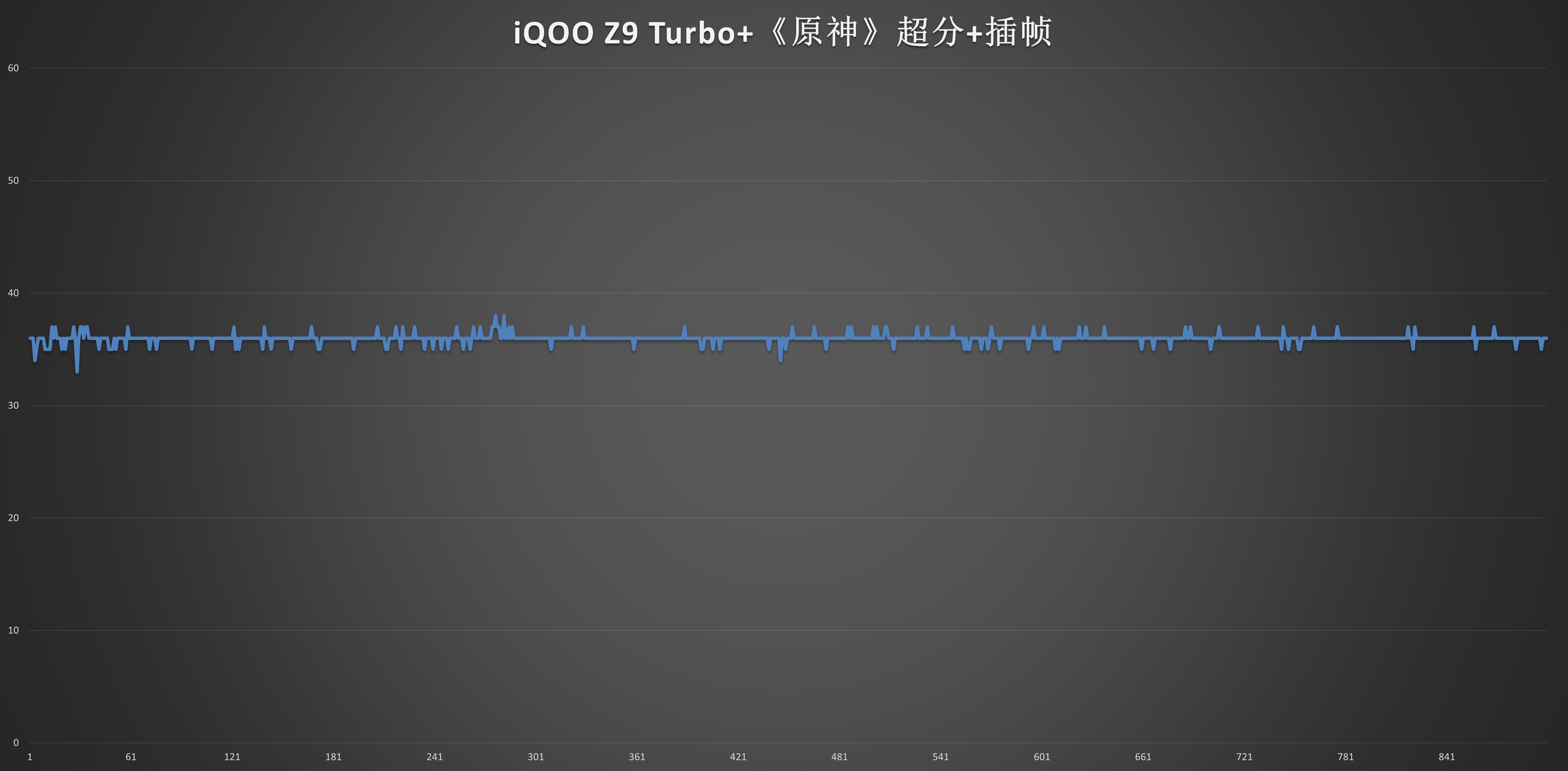 再来看看《原神》,iQOO Z9 Turbo+可以将画面超分插帧1.5K+72帧,采用的依然是原生36帧+1插1的做法,同时开启超分和插帧后,整机功耗和原生60帧运行差别不大,就是机身温度会偏高一些。