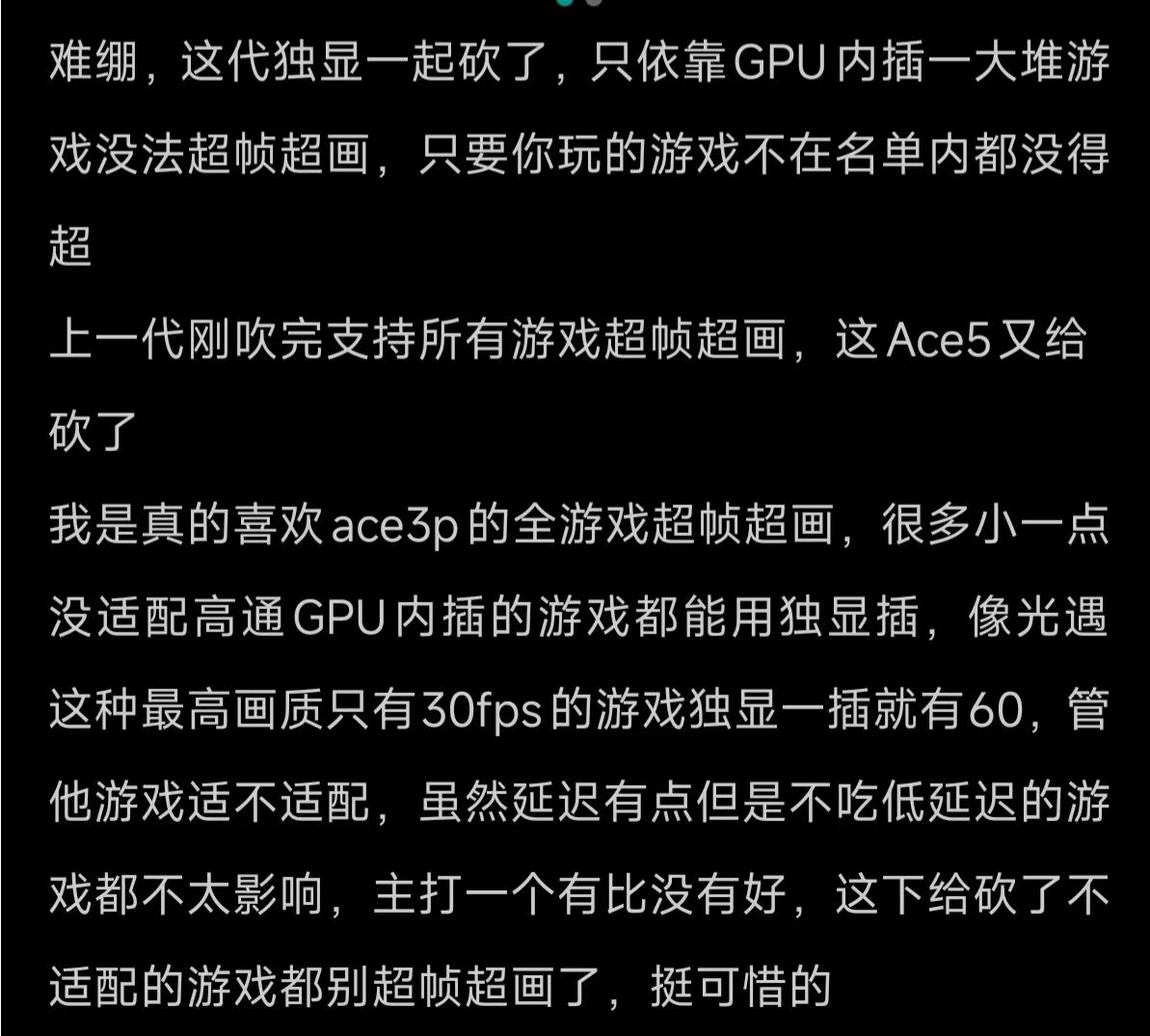而且你可能不信,事实上,现在依然有不少酷安网友现在依然在为一加Ace 5系列放弃外挂“独显芯片”感到不满。