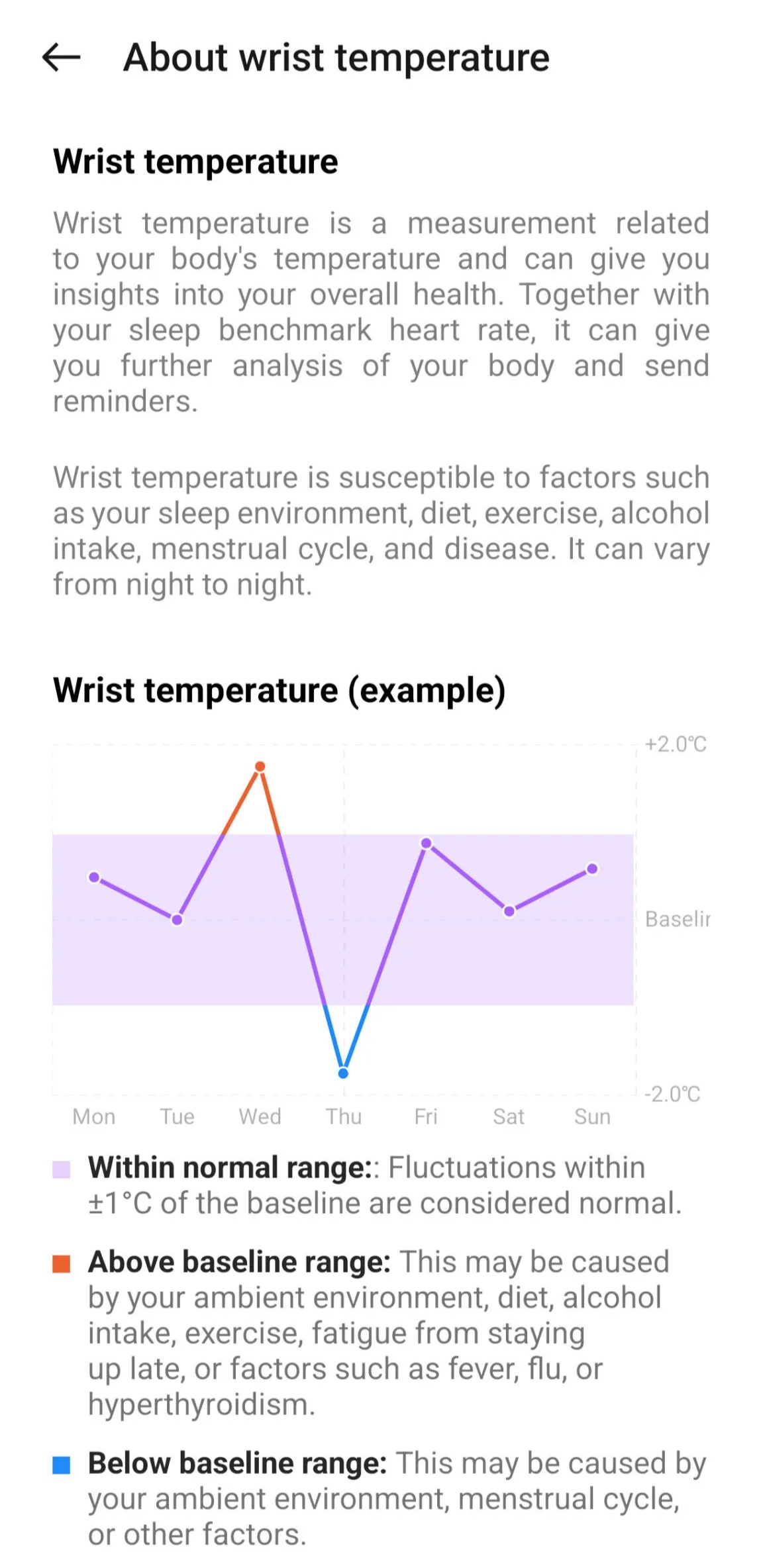 腕温测量:通过手腕测量体温,需连续佩戴至少五天并包含一次超过四小时的睡眠记录才能确保准确性。