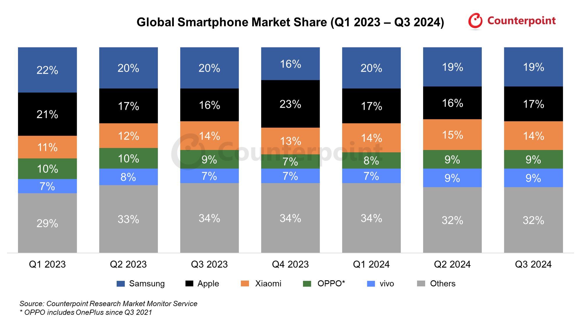 根据市场调查机构 Counterpoint Research 公布的数据,2018 年第 3 季度,小米的全球智能手机占有率不到 10%;而到 2024 年第 3 季度,小米占有率上升至 14%,紧随三星(19%)和苹果(17%)之后。