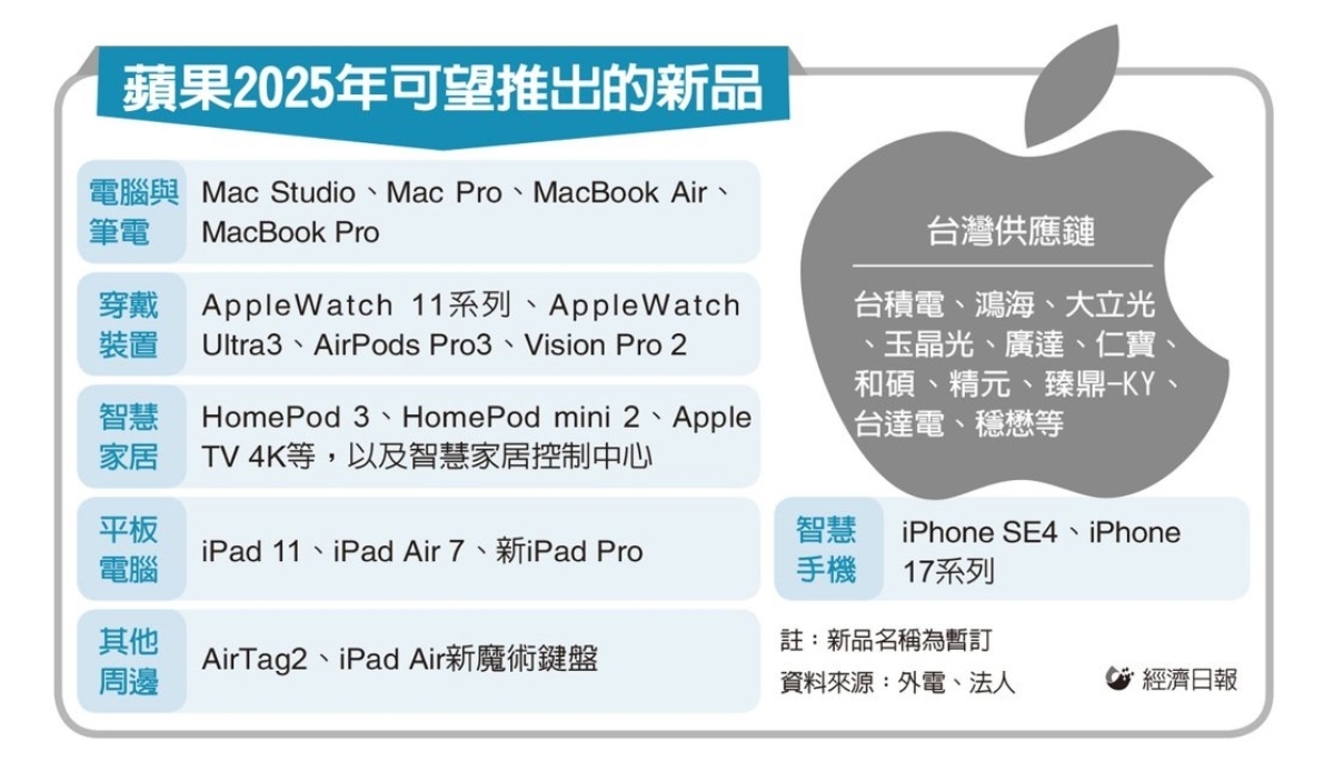 穿戴方面,苹果可望推出Apple Watch 11系列、Apple Watch Ultra 3、AirPods Pro 3及Vision Pro 2等硬件,锁定各种果粉需求。