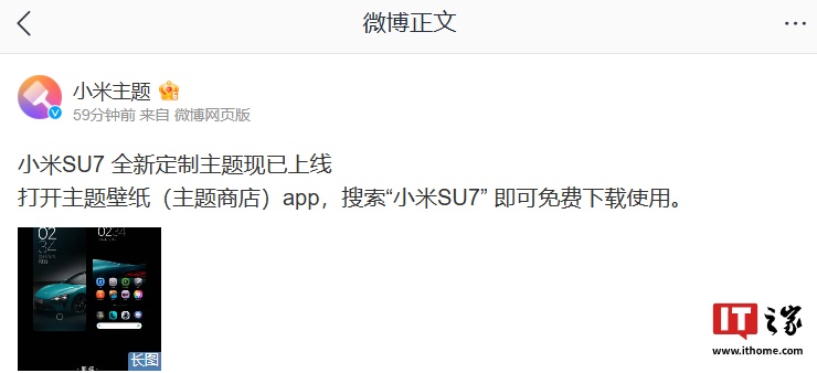 IT之家 1 月 1 日消息,小米主题官方今日发文宣布,小米手机“xiaomi SU7 全新定制主题”上线,用户打开主题壁纸(主题商店)App,搜索“小米 SU7”可免费下载使用。