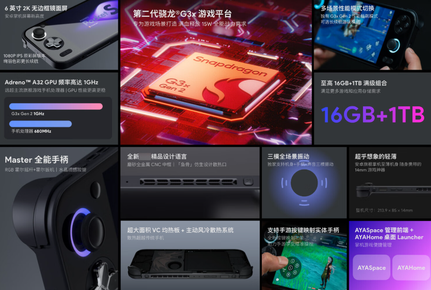 该掌机搭载第二代骁龙 G3x 平台,配备 LPDDR5X 8533Mbps RAM 和最高 UFS 4.0 闪存(128GB 为 UFS 3.1)、6 英寸 2K IPS 屏,内置 6000mAh 电池,配备 VC 均热板,VC 面积超过 5180mm²,散热鳍片面积超过 7053mm²,配有散热风扇,号称可以实现 15W 稳定输出。