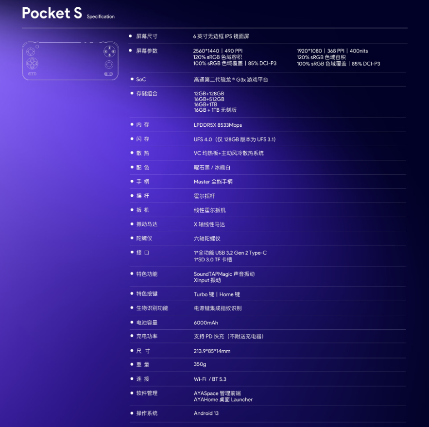 IT之家附 AYANEO Pocket S 游戏掌机参数如下: