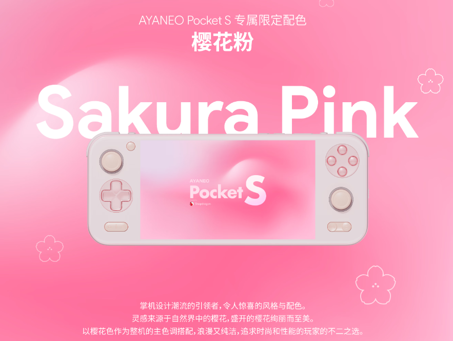 IT之家 1 月 1 日消息,AYANEO Pocket S 游戏掌机樱花粉限定版现正式开售,该款掌机搭载第二代高通骁龙 G3x 平台,号称“限量现货发售”,首发价 2999 元起。
