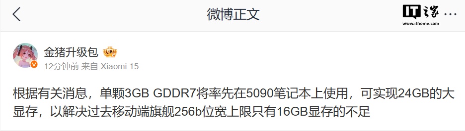 根据有关消息,单颗 3GB GDDR7 将率先在 5090 笔记本上使用,可实现 24GB 的大显存,以解决过去移动端旗舰 256b 位宽上限只有 16GB 显存的不足