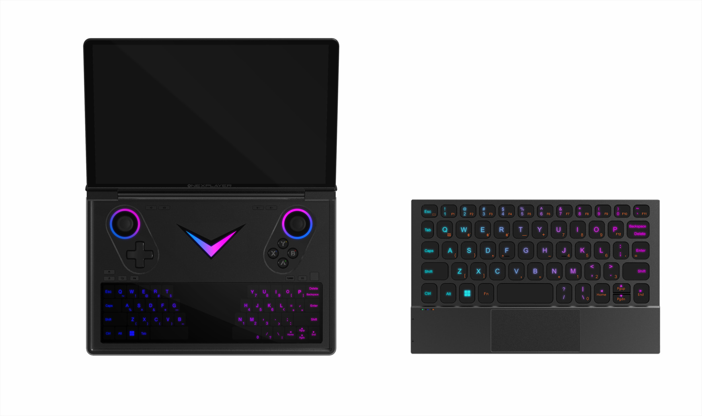 据官方此前预热,OnexPlayer G1 壹号 mini 游戏本内置“游戏控制器”和“键盘”两套输入设备,键盘可以直接盖在游戏控制器上。新机还配备下沉式隐藏摇杆,当玩家移开笔记本模式键盘时,可以直接手持使用,并且支持通过摇杆和按键游玩。