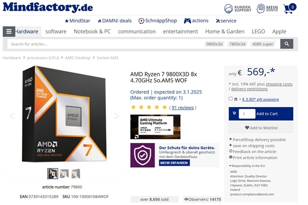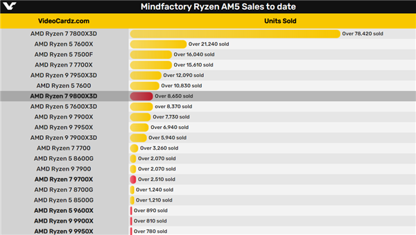 锐龙7 9800X3D是去年11月初上市的,尽管价格稍微有些高,但挡不住玩家的热情,MindFactory迄今已经卖出8650颗。