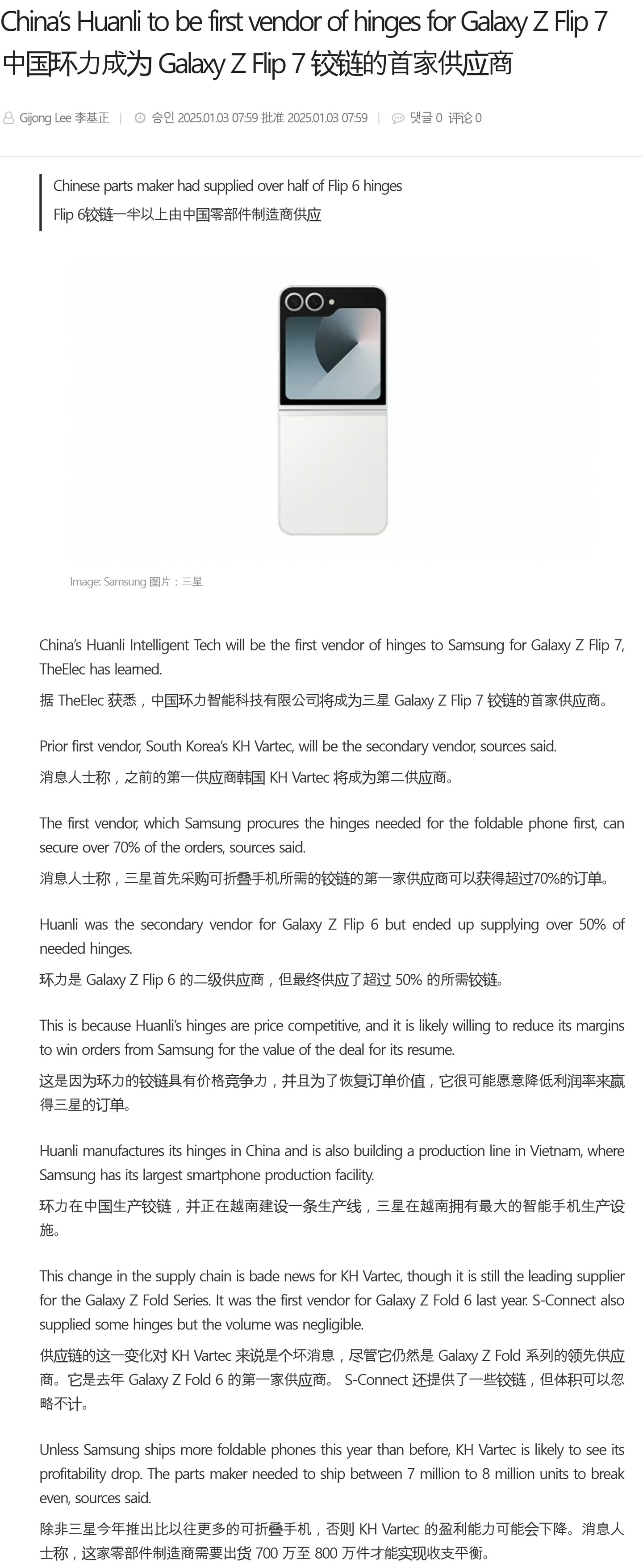 IT之家 1 月 3 日消息,外媒 The Elec 发文,透露东莞市环力智能科技有限公司(Huanli Intelligent Tech)成为三星 Galaxy Z Flip 7 小折叠手机铰链第一供应商,而韩国本土供应商的 KH Vartec 将成为第二供应商。