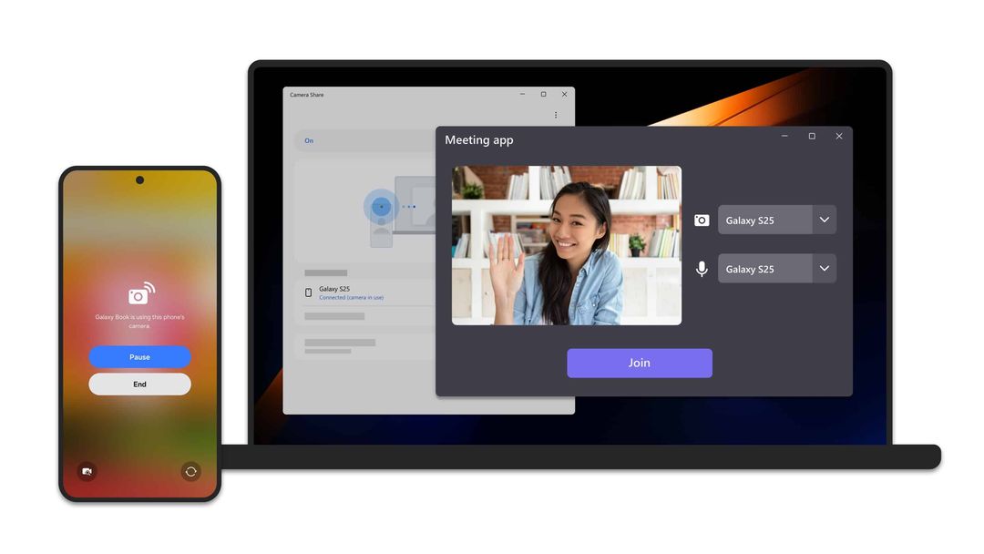 三星更新了 Microsoft Store 上的 Camera Share 应用,在最新上传的 2 张截图中,显示 Galaxy S25 作为 Galaxy Book 网络摄像头,表明随着发布日期临近,三星不再回避命名或展示未发布的旗舰产品。