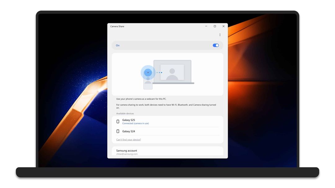 IT之家注: Camera Share 是一款让 Galaxy 手机作为 Galaxy Book 笔记本电脑摄像头的应用程序。目前该应用仍在开发中,从而增强 Galaxy 生态系统,实现三星产品间的无缝连接。