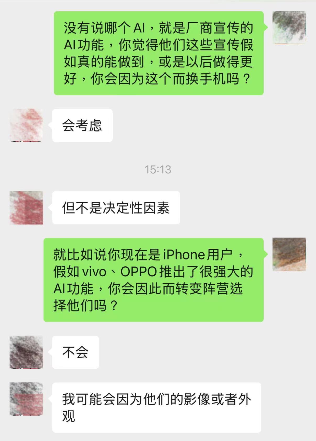 事实上,大家都对手机的影像、性能和设计更为看重。这与我们之前调研的结果相似——AI只是锦上添花的附加项。其中一位受访者目前的主力用机是iPhone 15 Pro,被问到对于即将入华的苹果智能有何看法时,他只是表示有兴趣,但不会太在意。AI也同样不会成为他跳转阵营的因素,即便目前中国手机厂商的AI功能已经做得足够强大,花样也比苹果智能多太多。