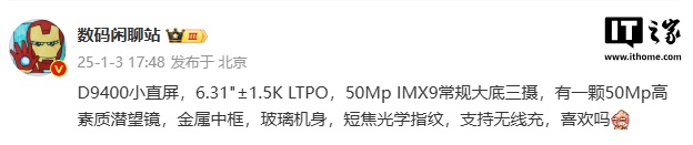 IT之家 1 月 3 日消息,博主 @数码闲聊站 今日曝光了一款天玑 9400 小直屏手机的主要参数,评论区网友推测为 OPPO Find X8 mini。