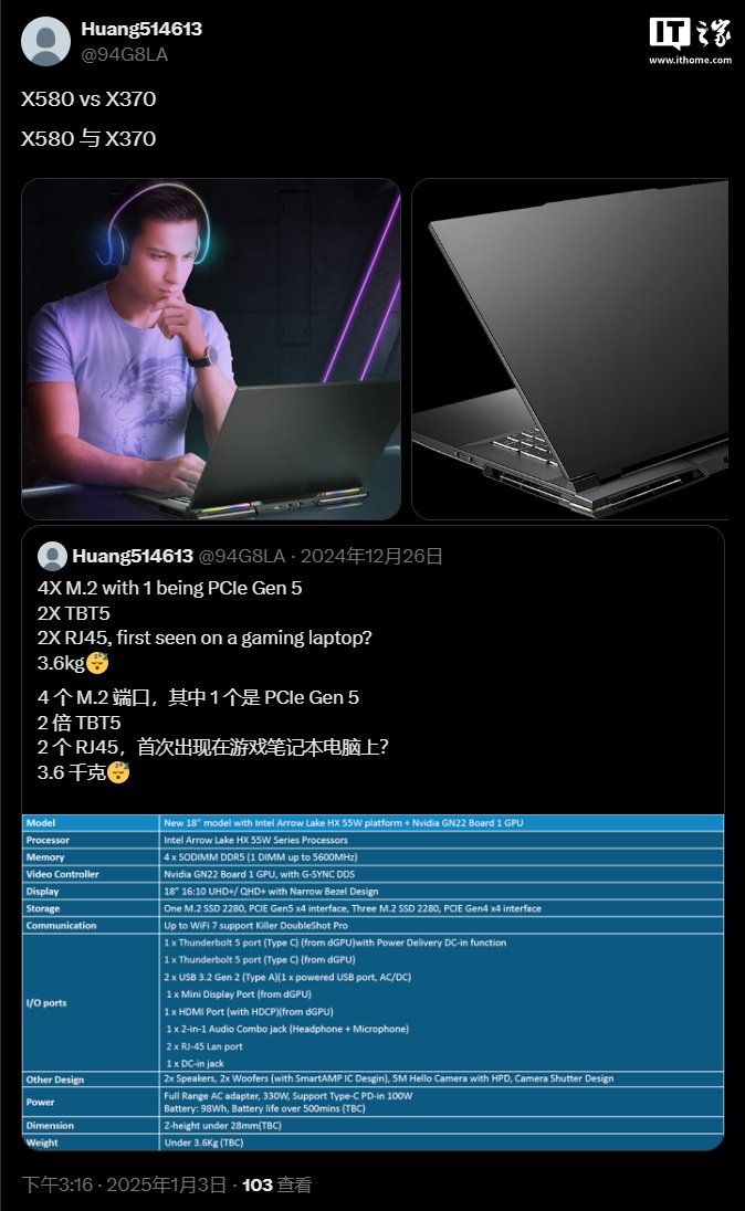 IT之家 1 月 3 日消息,X 平台爆料人 Huang514613 今日曝光了一款蓝天 X580 游戏本模具的外观,采用了游戏本罕见的双网口设计。
