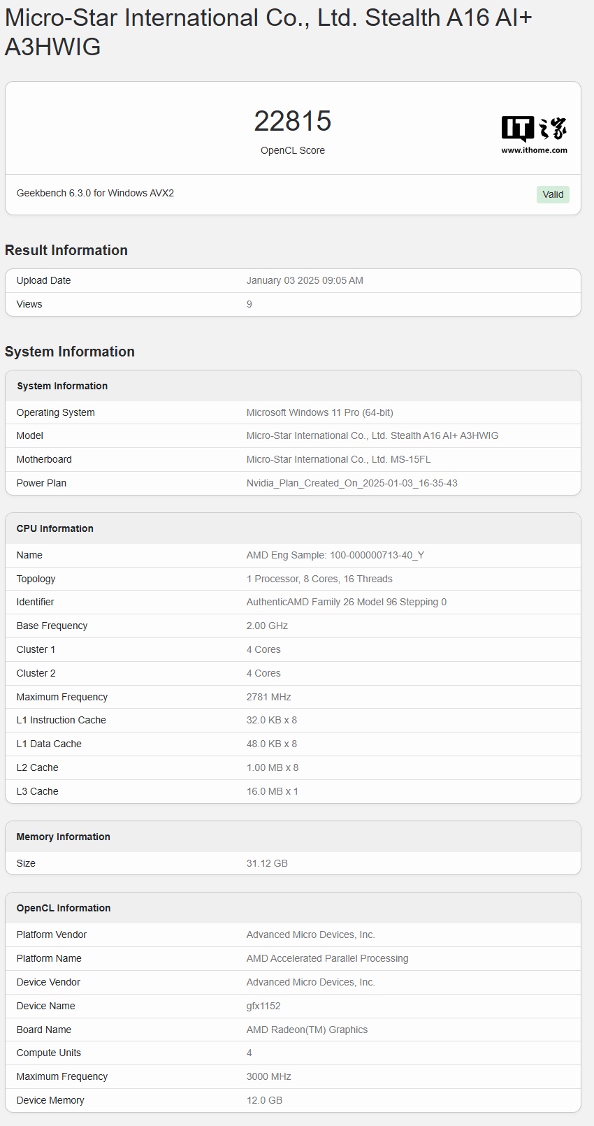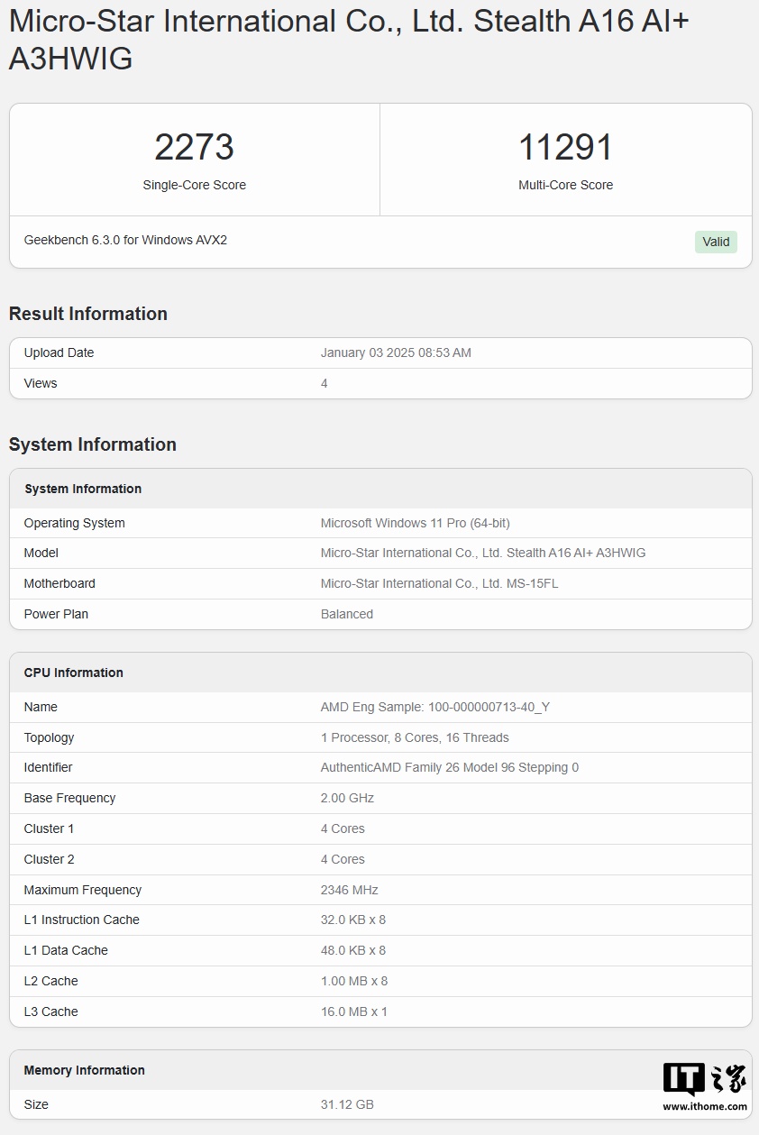 IT之家 1 月 3 日消息,微星 Stealth A16 AI+(对应绝影 16 AI+)工程机今天出现在了 Geekbench 上并进行了多种联网跑分。