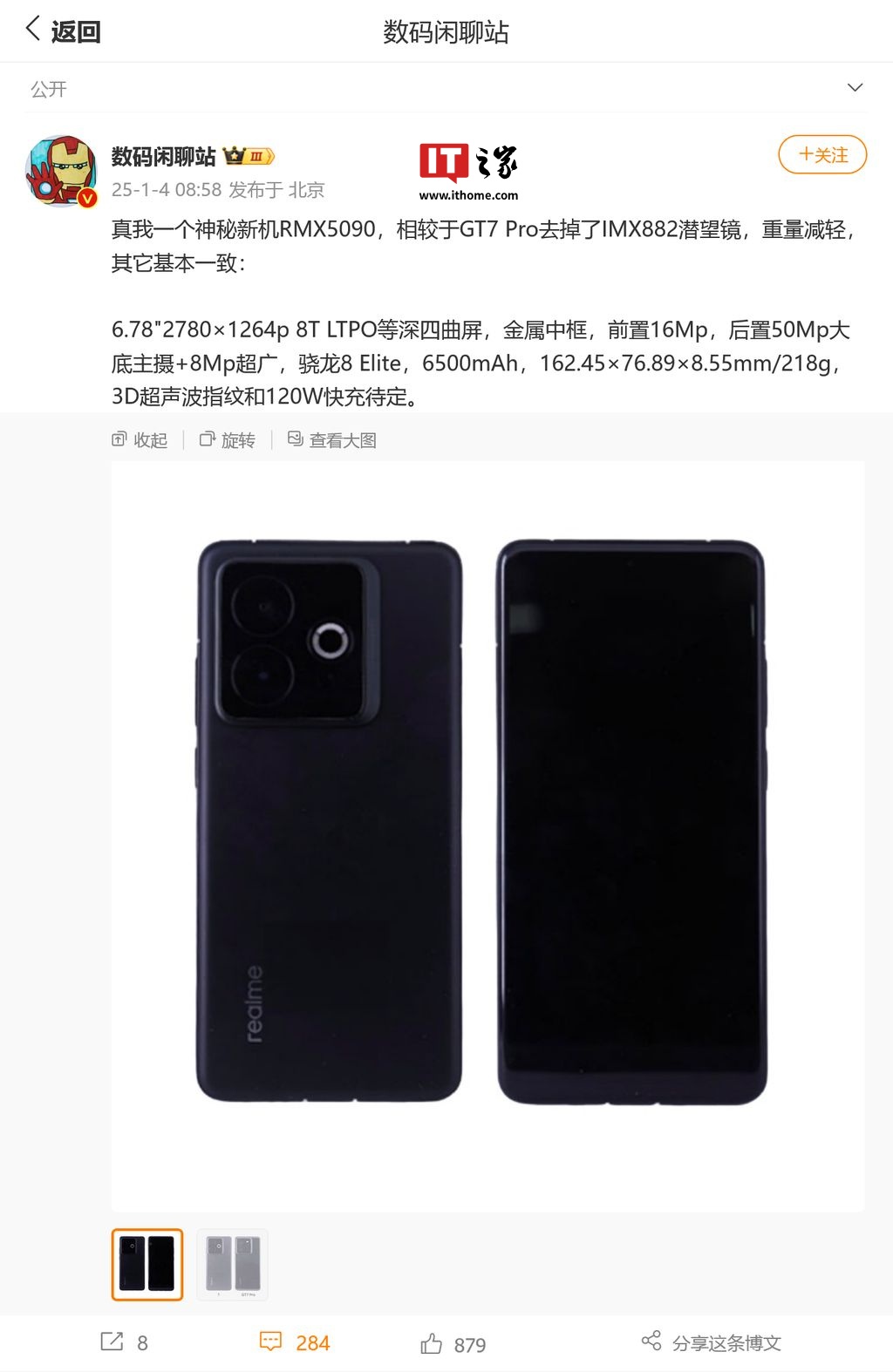 IT之家 1 月 4 日消息,消息源 @数码闲聊站 今天(1 月 4 日)发布微博,曝料发现了型号为 RMX5090 的 realme 真我新机,整体规格和 GT7 Pro(重量 222.8 克)相同,主要去掉了 IMX882 潜望镜头,重量减轻至 218 克。