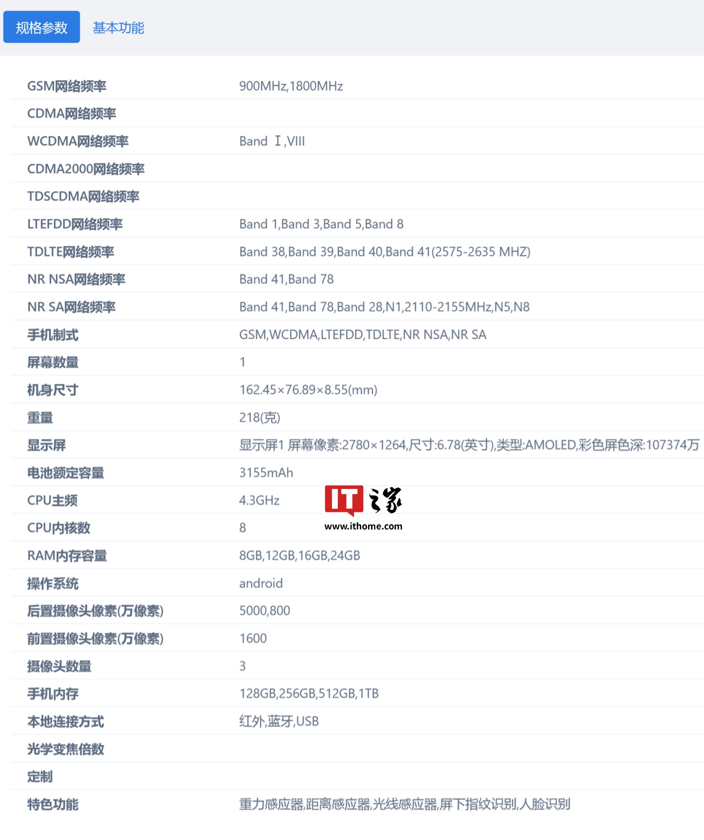 IT之家查询工信部网站,该机会有 128GB、256GB、512GB、1TB 存储,8GB、12GB、16GB、24GB 内存选项,配备 5000 万像素主摄和 800 万像素辅助摄像头,前置 1600 万像素自拍摄像头。