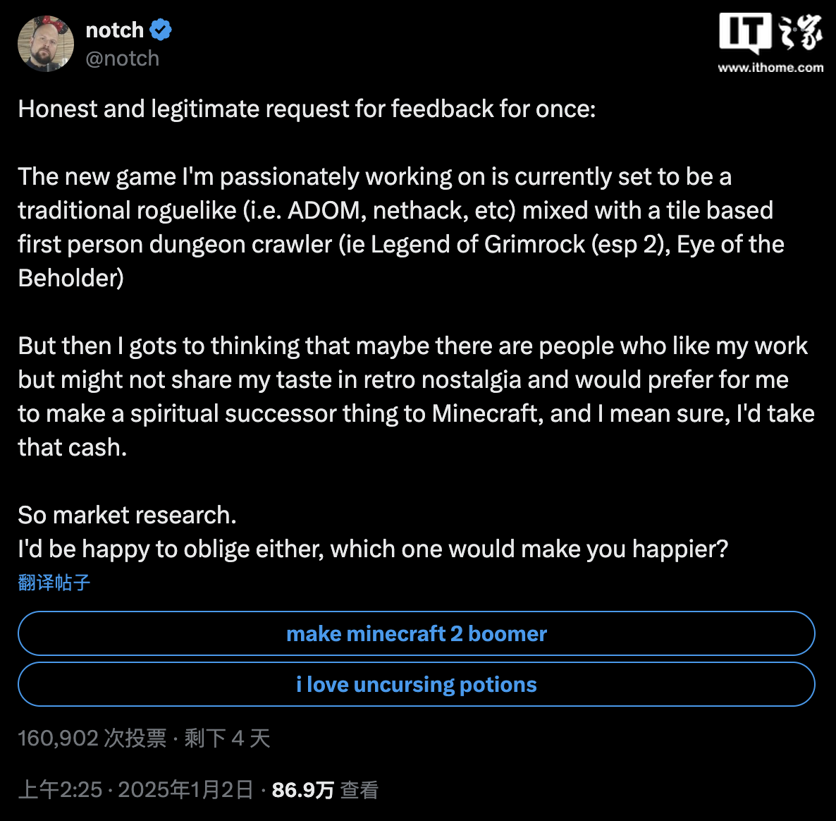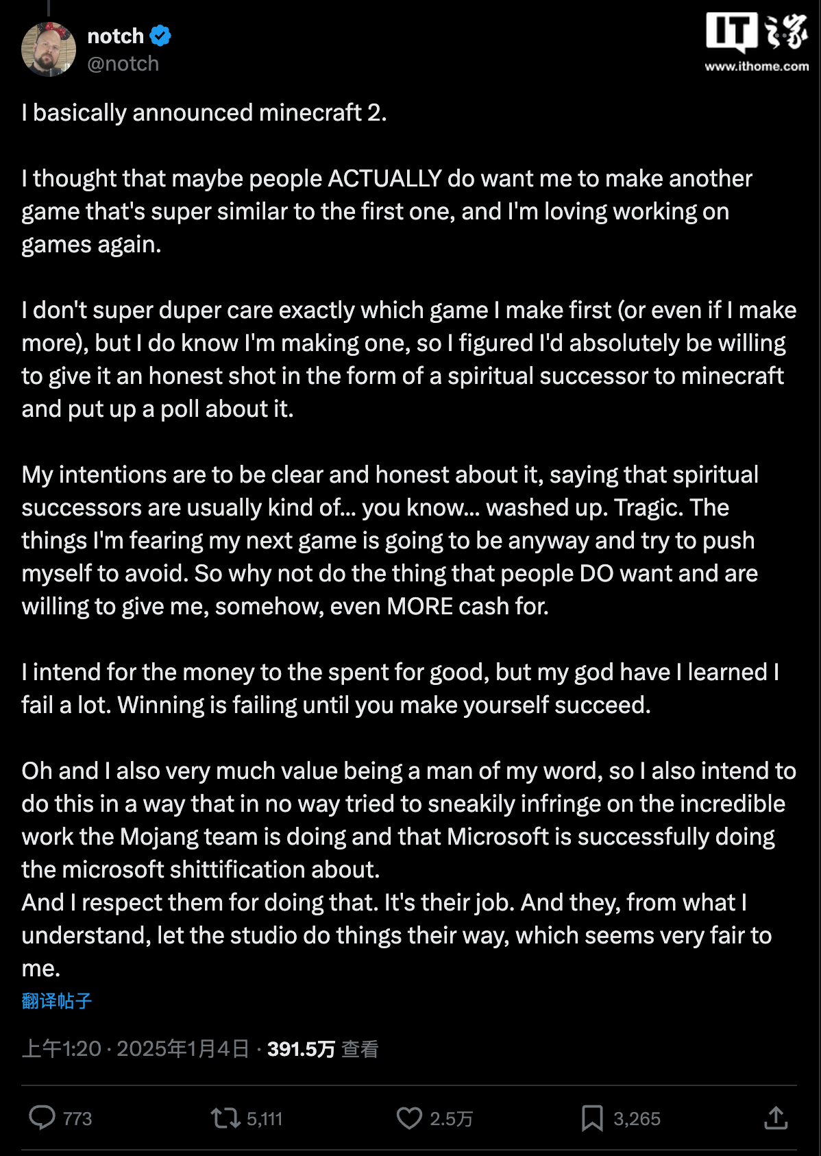 IT之家 1 月 4 日消息,开发了《我的世界》的 Markus Persson(Notch)今日宣布了《我的世界 2》的制作计划。尽管《我的世界》的知识产权归微软所有,微软同时也拥有开发这款游戏的 Mojang Studios,但微软并不拥有《我的世界》的创意或概念。