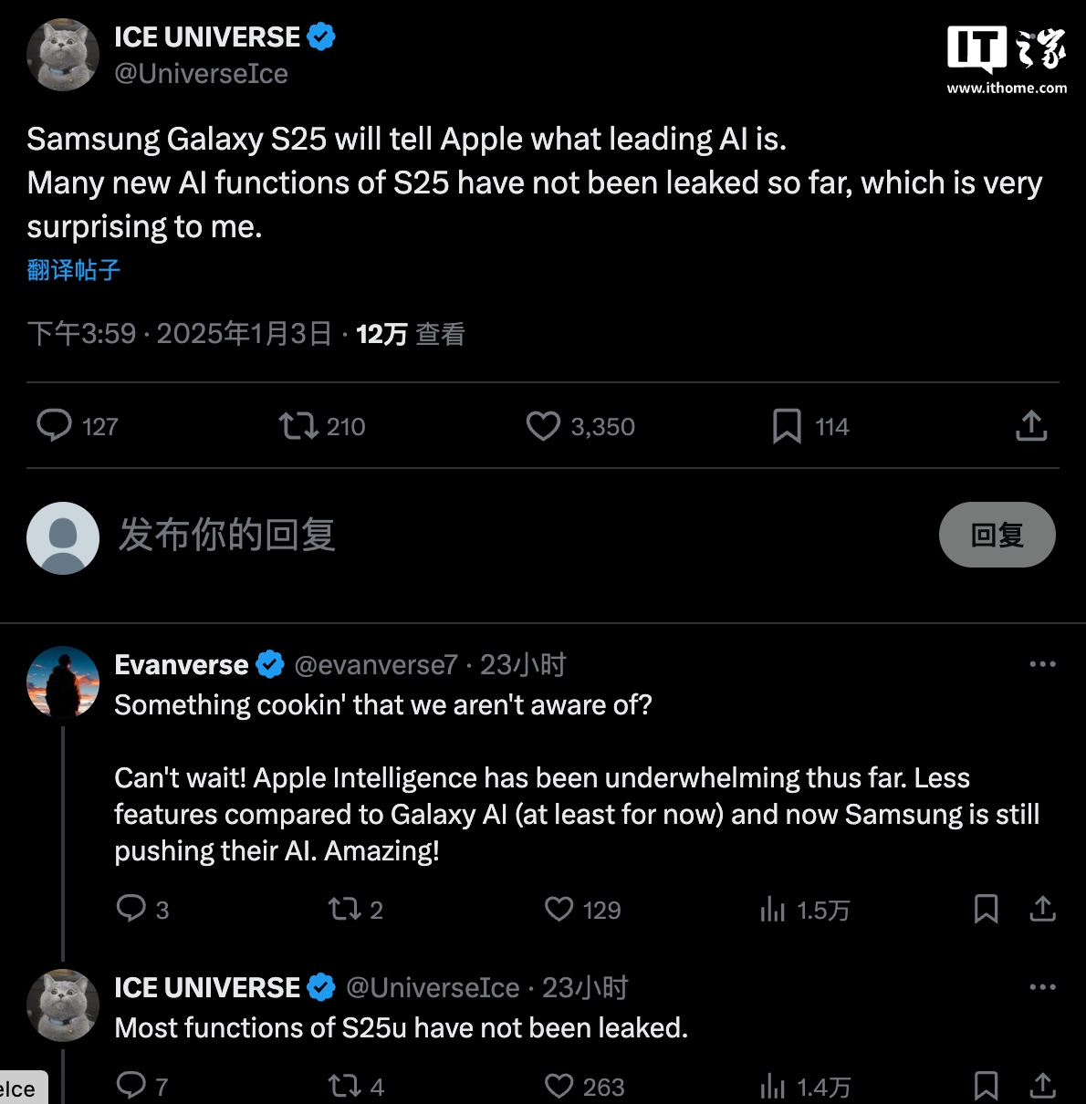 另一位爆料者 Evanverse 也回应了帖子,发表了自己对三星与苹果在 AI 战略方面的看法。他认为相比于苹果对待 AI 技术的“谨慎”,三星显得更具“雄心”。他还强调,三星在 S25 系列的软件开发上表现积极,丝毫没有松懈。