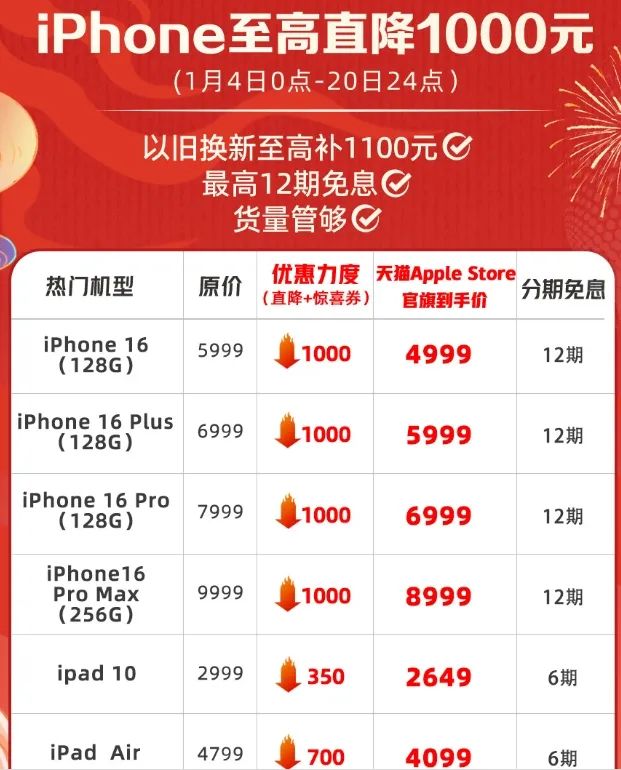 相比苹果官网最高800元优惠,这次苹果天猫官方旗舰店的折扣力度更大。在1月4日0点至20日24点期间,iPhone 16全系列直降800元,叠加200元惊喜券后,最高优惠达到1000元,到手价4999元起,而且还可叠加使用12期分期免息,每天仅需13元左右。