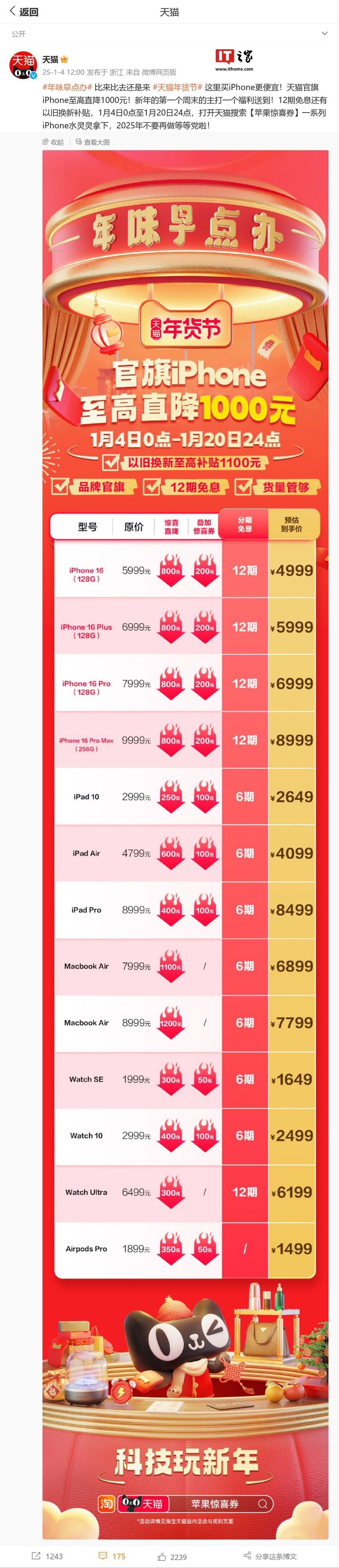 IT之家 1 月 4 日消息,@天猫 官方今天(1 月 4 日)发布微博,称苹果天猫官方旗舰店公布年货节政策,全线产品开启官方惊喜直降,iPhone 至高直降 1000 元,并支持 12 期免息和以旧换新补贴。