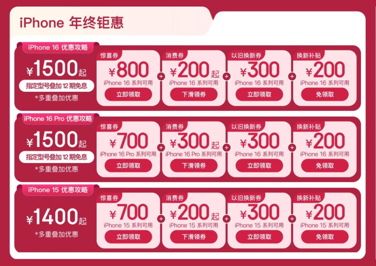 京东今天也开始了苹果年货节,iPhone 16 系列领券立减 1000,以旧换新再补 500 起,再享 12 期免息,还可叠加全国可用的杭州消费券和陕西地区消费券:点此了解政府补贴。