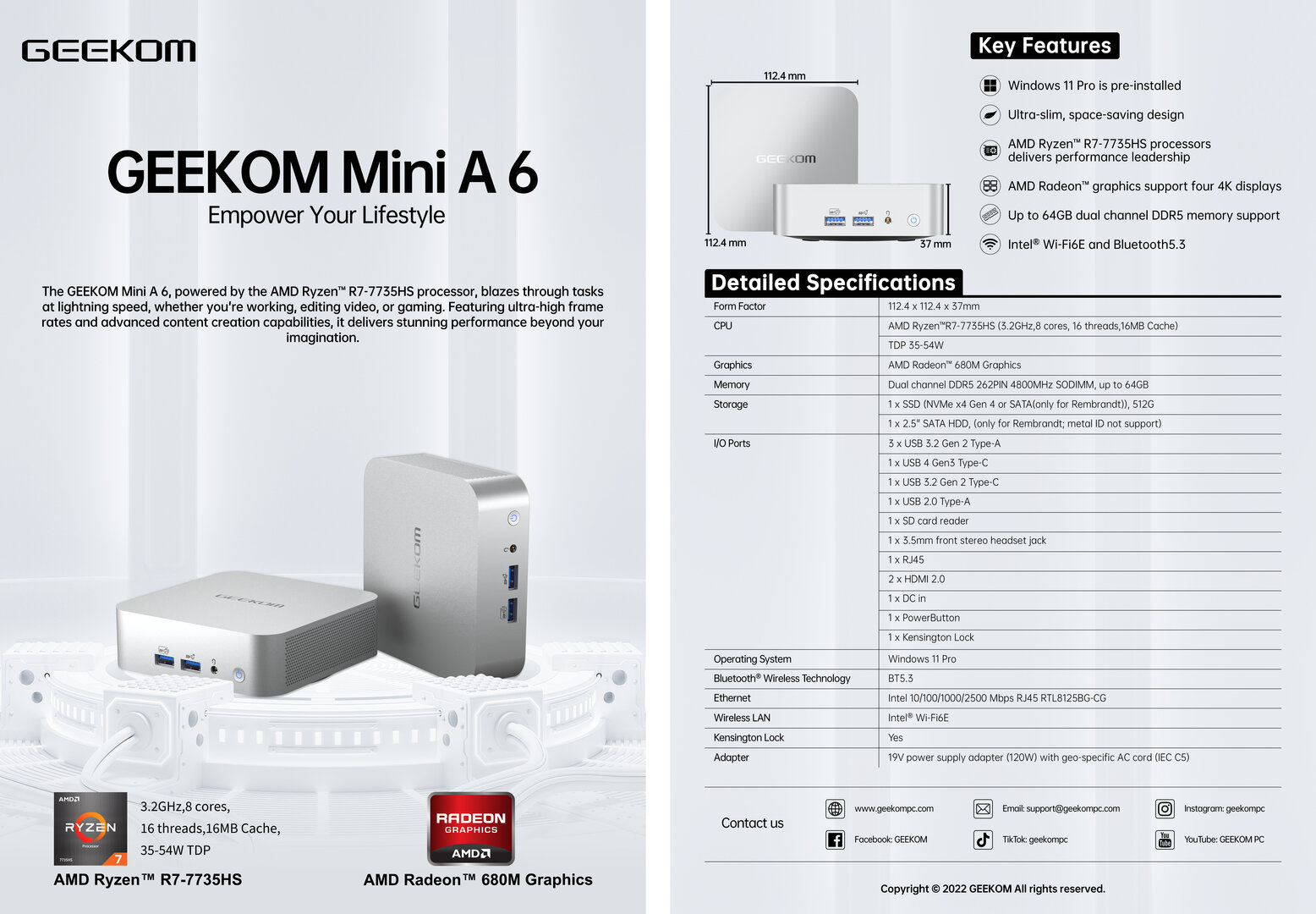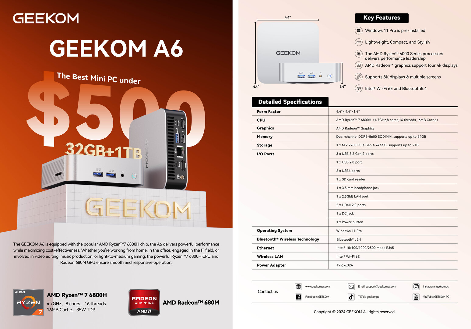 此外,该公司还推出了搭载 AMD 上上代芯片的积核 A6 迷你主机,这是一款定位在 500 美元(IT之家备注:当前约 3667 元人民币)以下级别的迷你主机,搭载 AMD 锐龙 R7 7735HS 或 R7 6800H,其他部分基本与上述型号相同,预计将于 2025 年 1 月中旬在全球范围内上市。