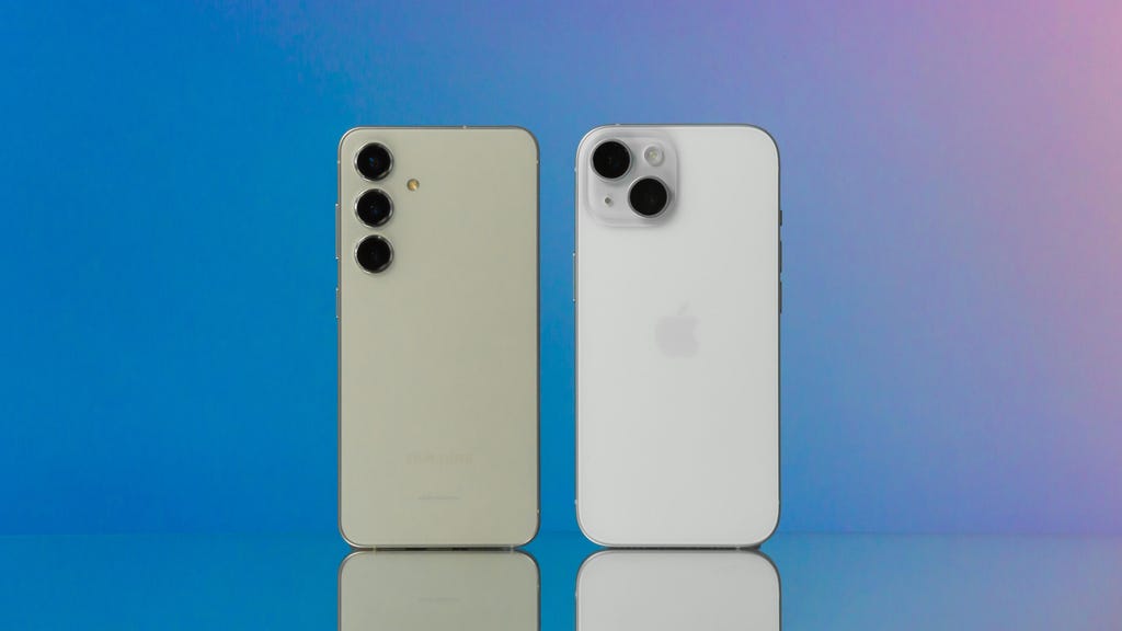 三星Galaxy S24(左)与iPhone 15。摄像头阵列不同,其余相似。James Martin/CNET