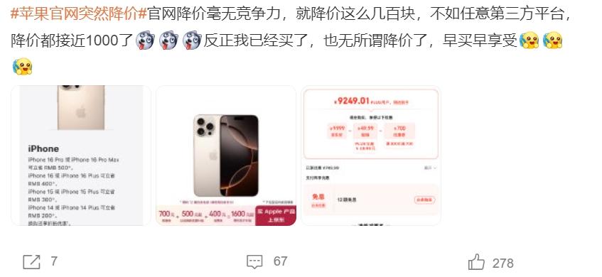这下该老用户骂骂咧咧了,难免会有人觉得被果子背刺了。刚买了 iPhone 16 系列才两个多月,苹果官方就已经两次降价,简直亏大了。去年双 11 天猫官方旗舰店也提供了 500 元的“苹果惊喜券”,只用早买早享受安慰一下自己了。
